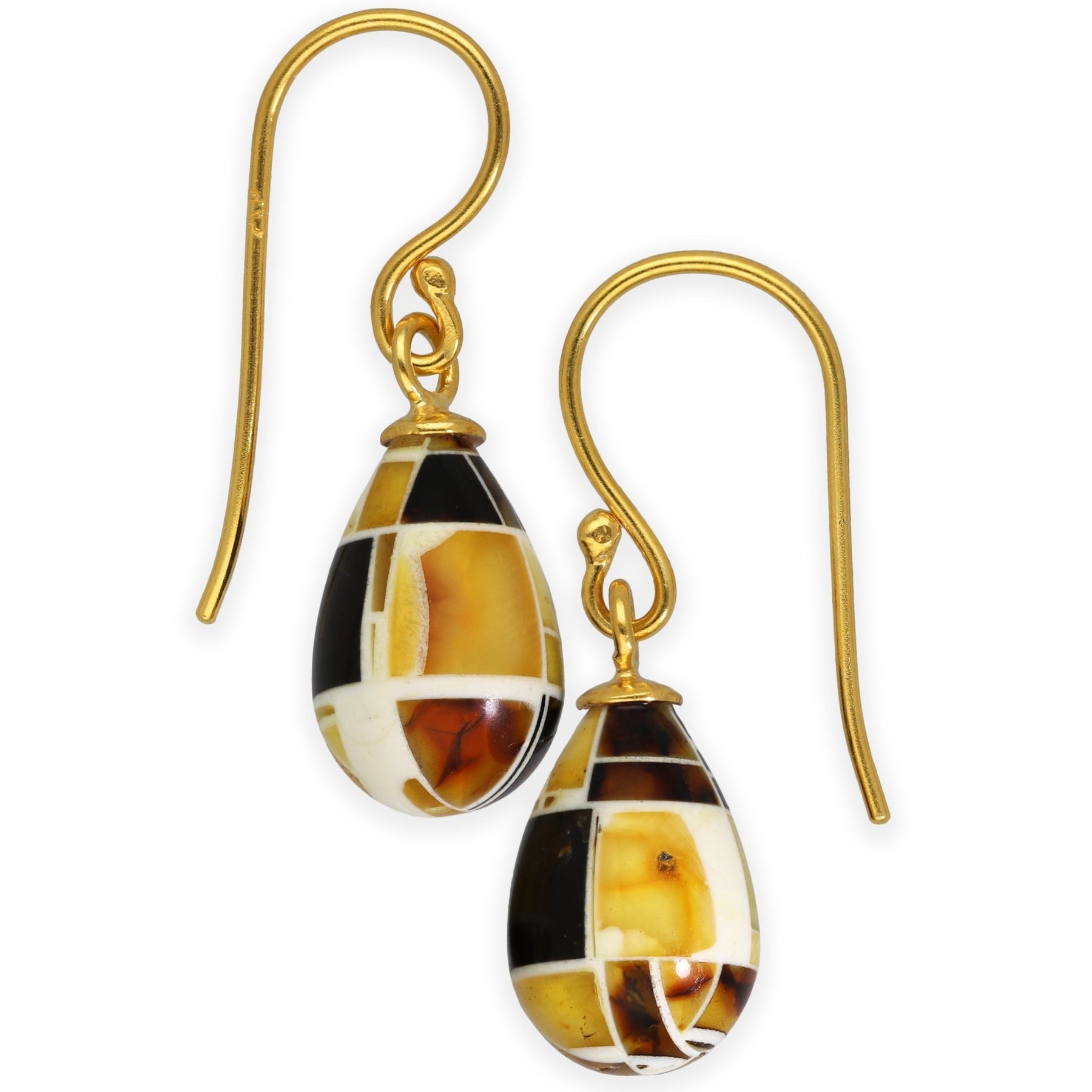 Handgefertigte hängende Ohrringe aus 925er Silber mit Mosaik aus kleinen Bernsteinstücken in Erdtönen.